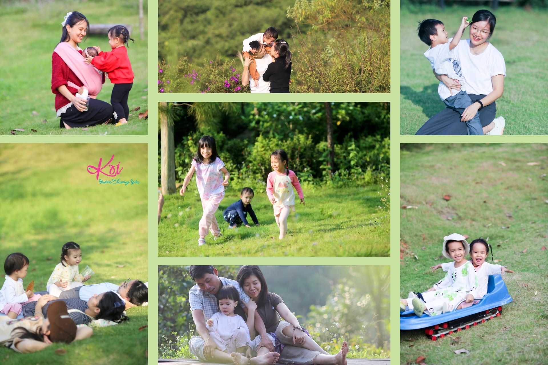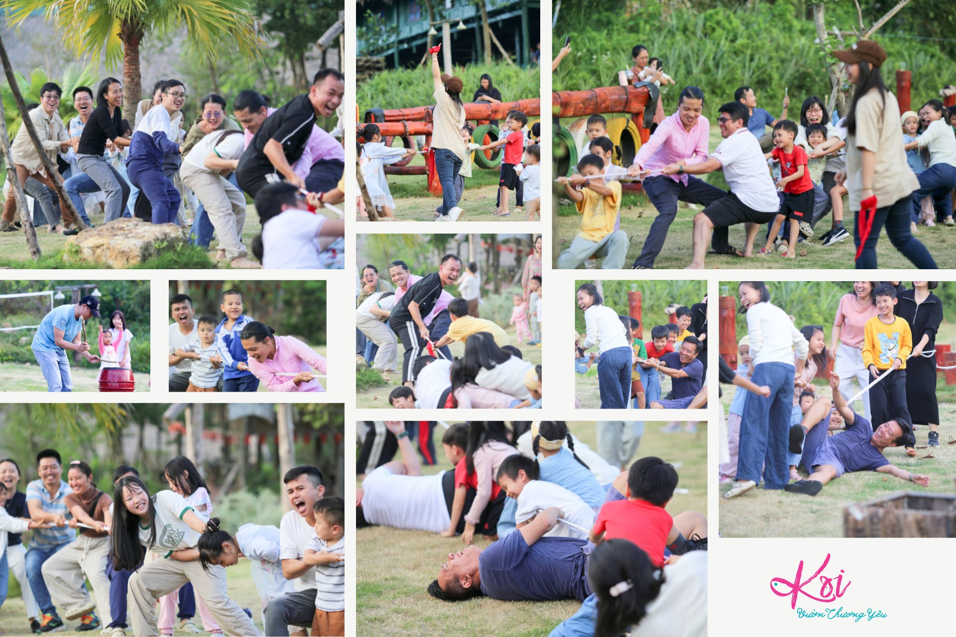 Kéo co, nhảy dây, bịt mắt bắt dê, trượt cỏ, hái hoa, bắt châu chấu, đếm máy bay, vầy nước, hát hò nhảy múa, ăn rồi ngủ… không chỉ mô tả các em bé Koi mà các ông bố bà mẹ Koi cũng đáng yêu vậy.